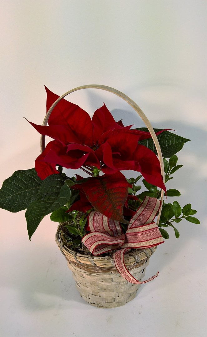 Punainen joulutähti korissa koristeltuna. Pidätämme oikeuden vaihtaa korin toiseen vastaavaan.