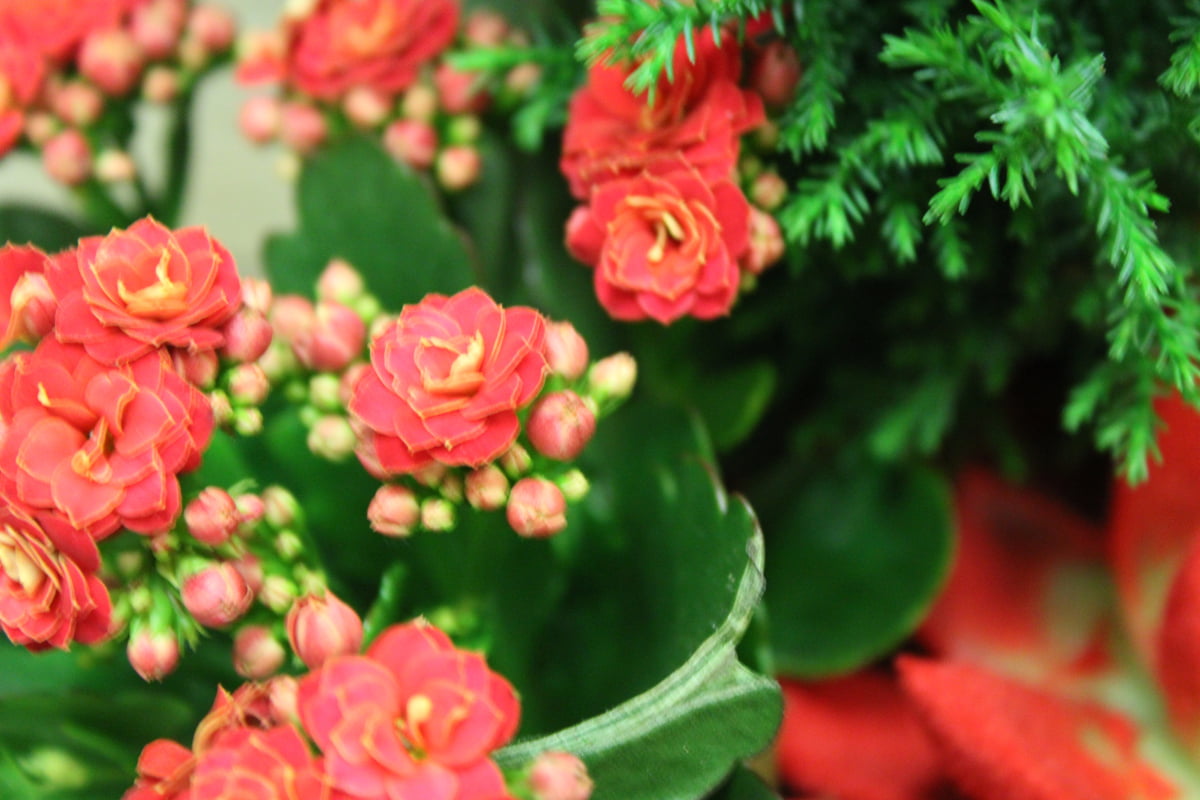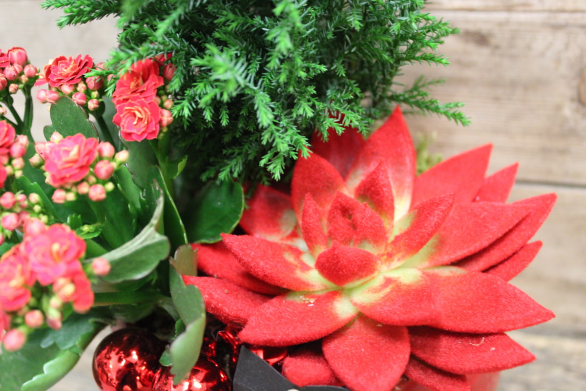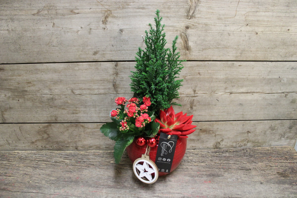 Komea sypressi, tulilatva ja mehitähti istutettuna punaiseen keramiikkapalloon. Jouluiset koristelut.