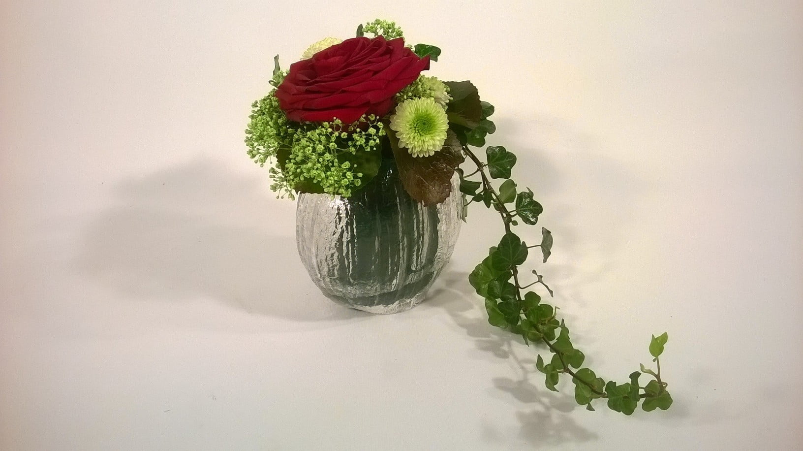 Romanttinen ruusuasetelma lasimaljakossa. Punaista ruusua,vihreää harsoa,pientä krysanteemia ja valuvaa muraattia.